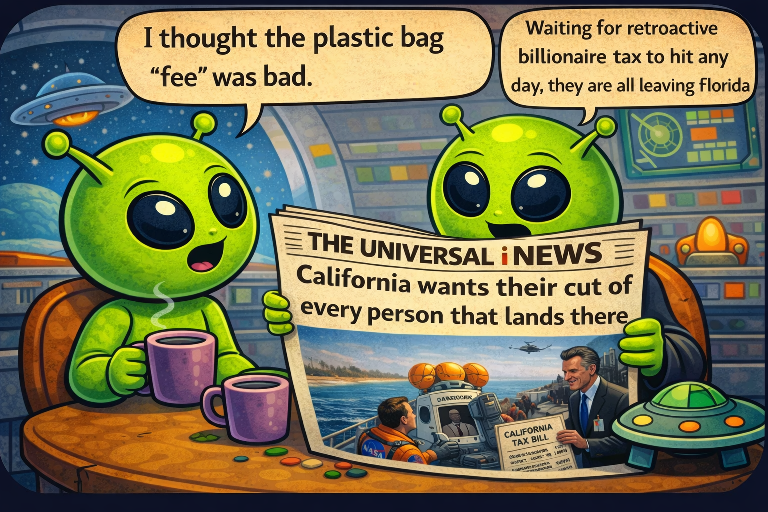 Smart Aliens avoid California By YNOT / April 11, 2026 / No Comments / Daily News HomeDaily News / Smart Aliens avoid California Visited 1 times, 1 visit(s) today ZZZ Leave a Reply Cancel replyYour email address will not be published. Required fields are marked *Comment * Name * Email * Website Save my name, email, and website in this browser for the next time I comment. XXX